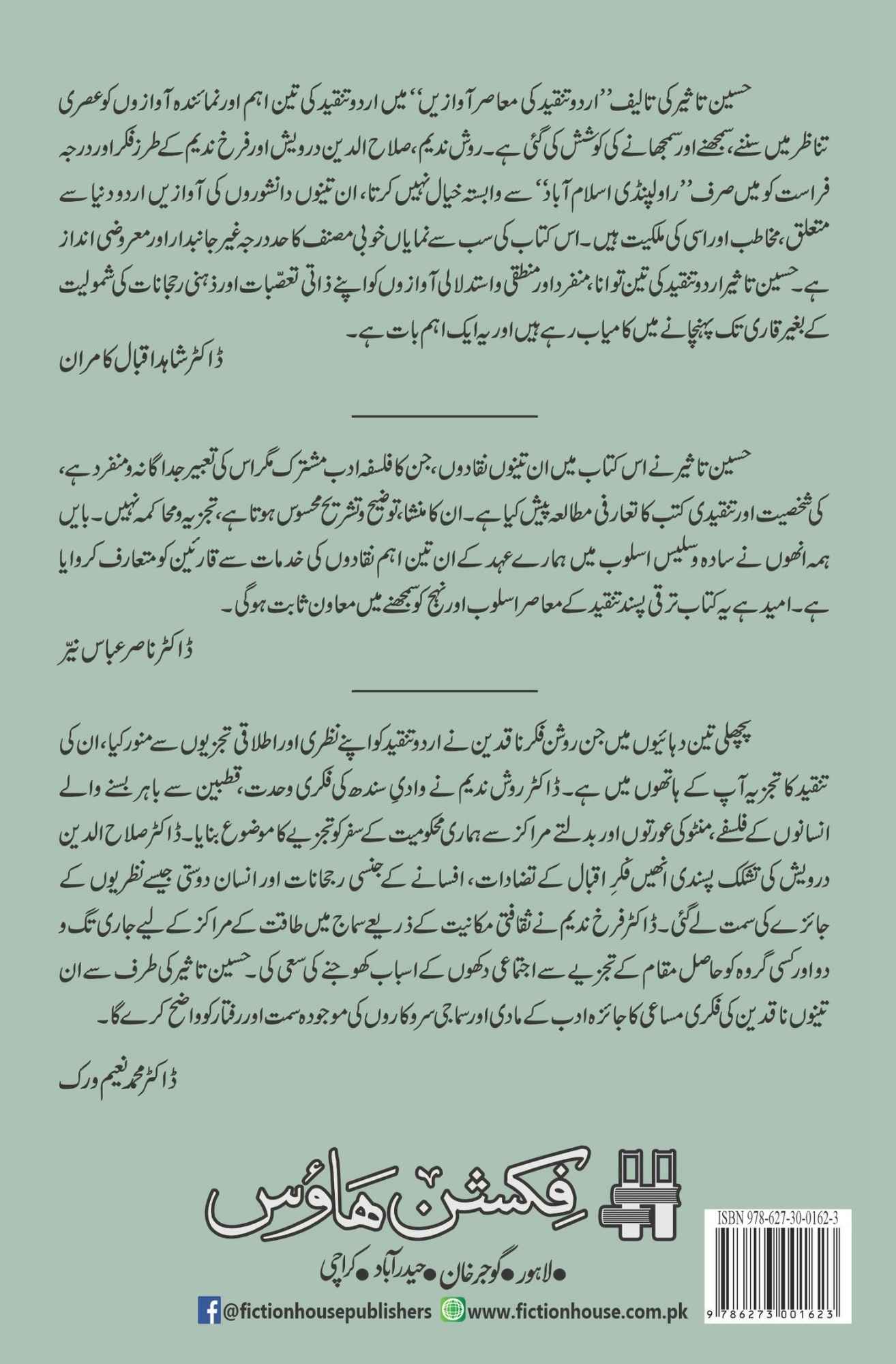 حسین تاثیر کی تالیف اردو تنقید کی معاصر آوازیں میں اردو تنقید کی تین اہم اور نمائندہ آوازوں کو عصری تناظر میں سنے، سمجھنے اور سمجھانے کی کوشش کی گئی ہے۔ روش ندیم ، صلاح الدین درویش اور فرخ ندیم کے طرز فکر اور درجہ فراست کو میں صرف راولپنڈی اسلام آباد سے وابستہ خیال نہیں کرتا، ان تینوں دانشوروں کی آوازیں اردو دنیا سے متعلق ، مخاطب اور اس کی ملکیت ہیں۔ اس کتاب کی سب سے نمایاں خوبی مصنف کا حد درجہ غیر جانبدار اور معروضی انداز ہے۔ حسین تاثیر اردو تنقید کی تین تو انا منفرد اور منطقی و استدلالی آوازوں کو اپنے ذاتی تعصبات اور ذہنی رحجانات کی شمولیت کے بغیر قاری تک پہنچانے میں کامیاب رہے ہیں اور یہ ایک اہم بات ہے۔