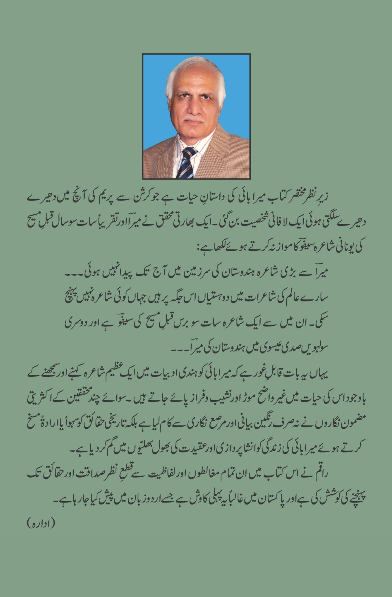 زیر نظر مختصر کتاب میرا بائی کی داستان حیات ہے جو کرشن سے پریم کی آنچ میں دھیرے دھیرے سلگتی ہوئی ایک لافانی شخصیت بن گئی ۔ ایک بھارتی محقق نے میرا اور تقریبا سات سو سال قبل مسیح کی یونانی شاعرہ سیفو کا موازنہ کرتے ہوئےلکھا ہے :