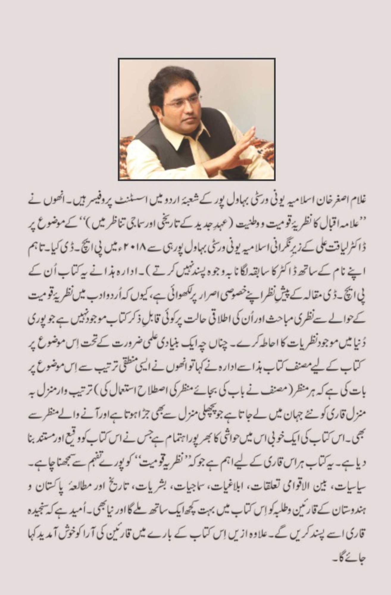 غلام اصغر خان کی کتاب "نظریہ قومیت: عالمی و مقامی تناظر" اپنے موضوع کے حوالے سے ایک اہم متن ہے جس میں انھوں نے مقامیت کی تہہ در تہہ متنوع جہات کو بیان کیا ہے۔ مثال کے طور پر قوم اور قومیت، قومیت کے خصائص و علائم، قومیت کے نامیاتی اجزا، تحریک قومیت کا آغاز و ارتقا، قومیت کے فوائد، قومیت کے نقصانات، قومیت کی اقسام، اسلام کا نظریہ قومیت اور برصغیر میں نظریہ قومیت کا ارتقا و پس منظر جیسے موضوعات کا احاطہ کیا گیا ہے۔
