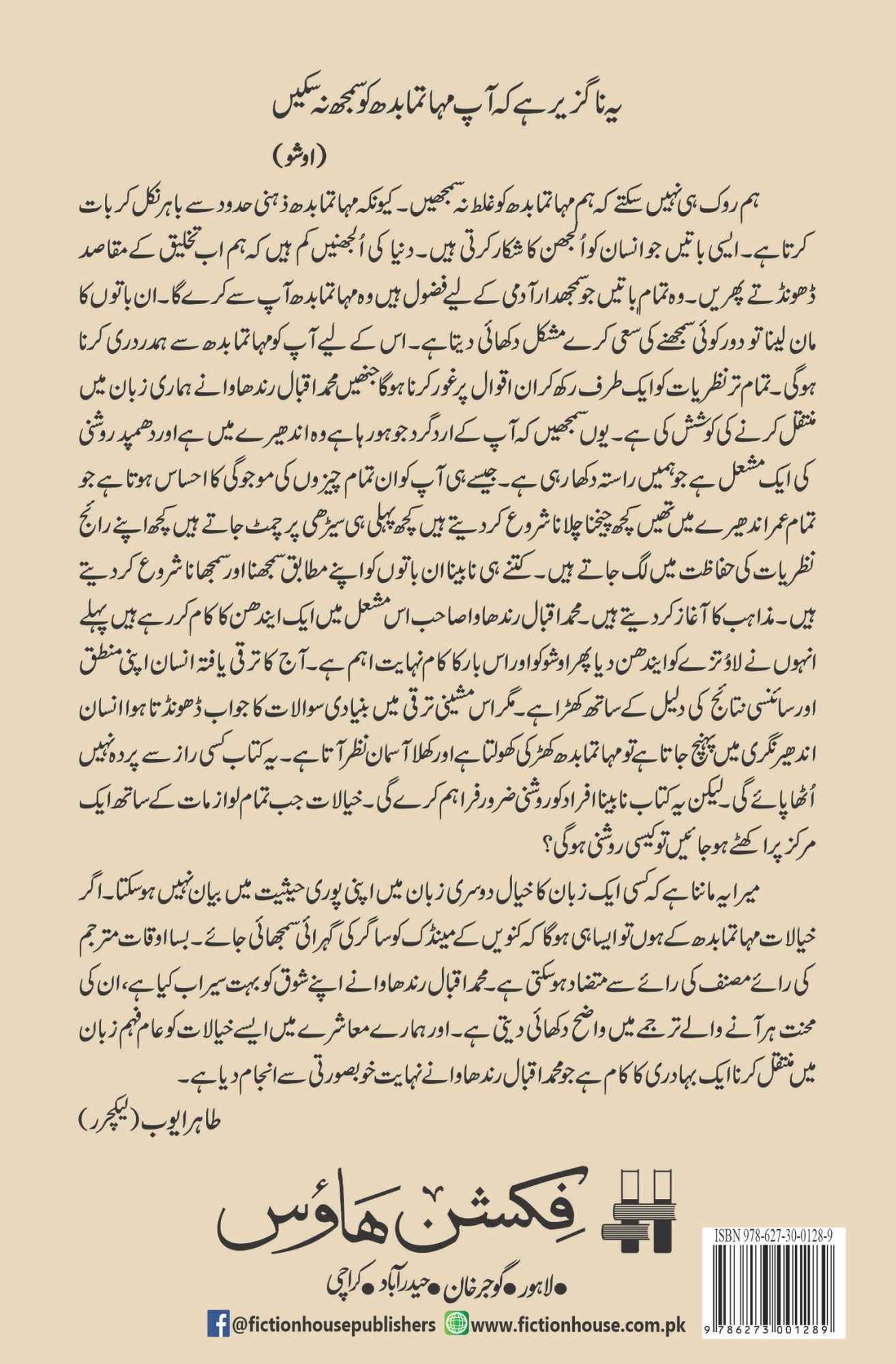 میرا یہ ماننا ہے کہ کسی ایک زبان کا خیال دوسری زبان میں اپنی پوری حیثیت میں بیان نہیں ہو سکتا۔ اگر خیالات مہاتما بدھ کے ہوں تو ایسا ہی ہوگا کہ کنویں کے مینڈک کو ساگر کی گہرائی سمجھائی جائے۔ بسا اوقات مترجم کی رائے مصنف کی رائے سے متضاد ہو سکتی ہے۔ محمد اقبال رندھاوا نے اپنے شوق کو بہت سیراب کیا ہے، ان کی محنت ہر آنے والے ترجمے میں واضح دکھائی دیتی ہے۔ اور ہمارے معاشرے میں ایسے خیالات کو عام فہم زبان میں منتقل کرنا ایک بہادری کا کام ہے جو محمد اقبال رندھاوا نے نہایت خوبصورتی سے انجام دیا ہے۔